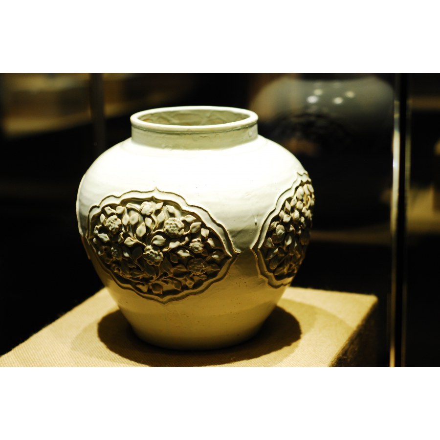 元卵白釉开光镂空贴塑花卉纹大罐