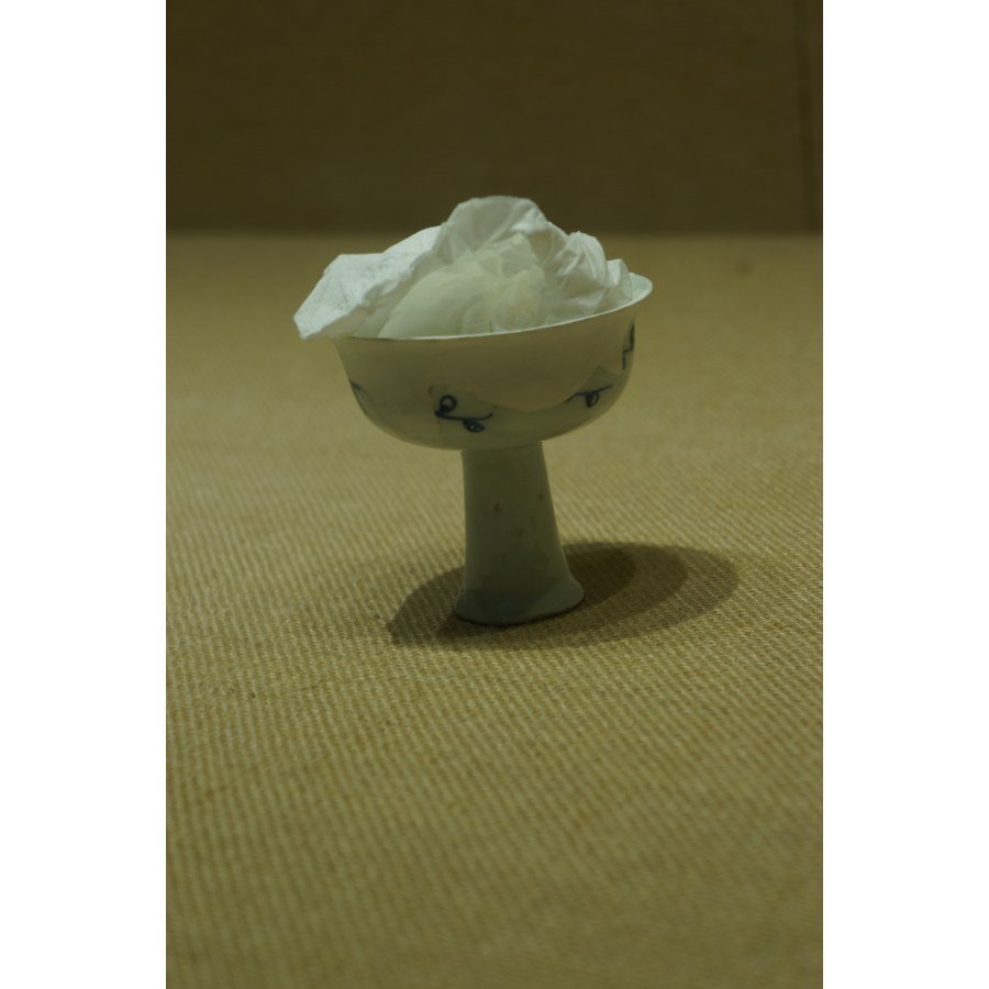 内部模印龙纹,外部青花松竹梅纹,杯体壁厚不足