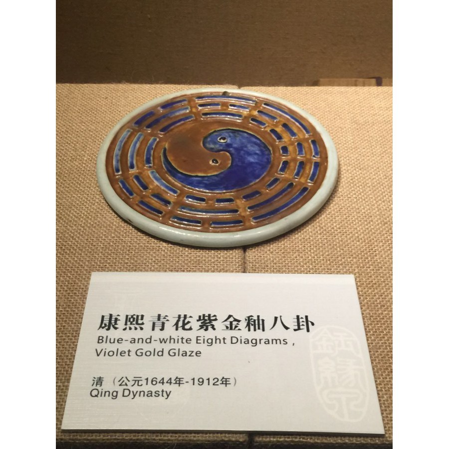 此件瓷器施釉两种,青花加紫金釉,凡是两种着色剂一次烧造,成功率都不会太高,故显珍贵。这是一件修复件,原本是碎的,并且少一卦。