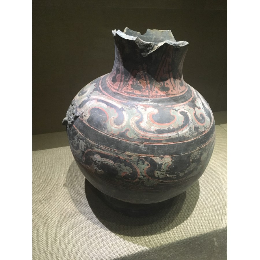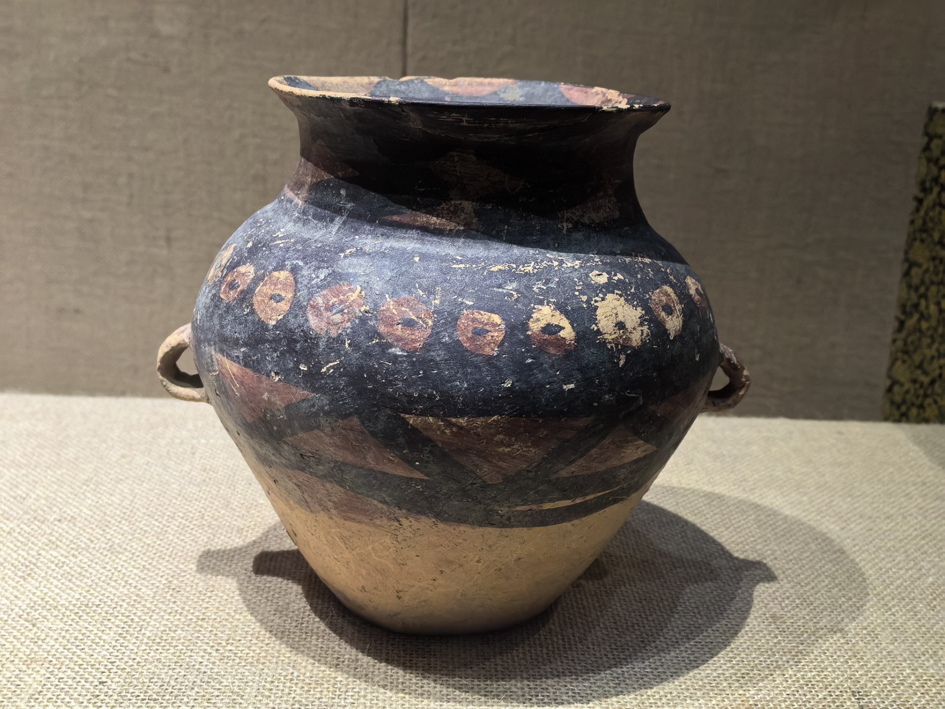 马家窑彩绘双耳陶罐,该器物属于马家窑文化的典型造型,彩绘图案保留完整,这个时期的图案之多样,题材之丰富,花纹之精美,构思之灵妙,是史前任何一种远古文化所不可比拟的,它丰富多姿的图案构成了典丽、古朴、大器、浑厚的艺术风格。它神奇的动物图纹,恢宏的歌舞,对比的几何形状,强烈的动感姿态,象黄河奔流的千姿百态,生生不息,永世旋动。它象黄河浪尖上的水珠,浪涛的起伏,臻成彩陶艺术的高峰。