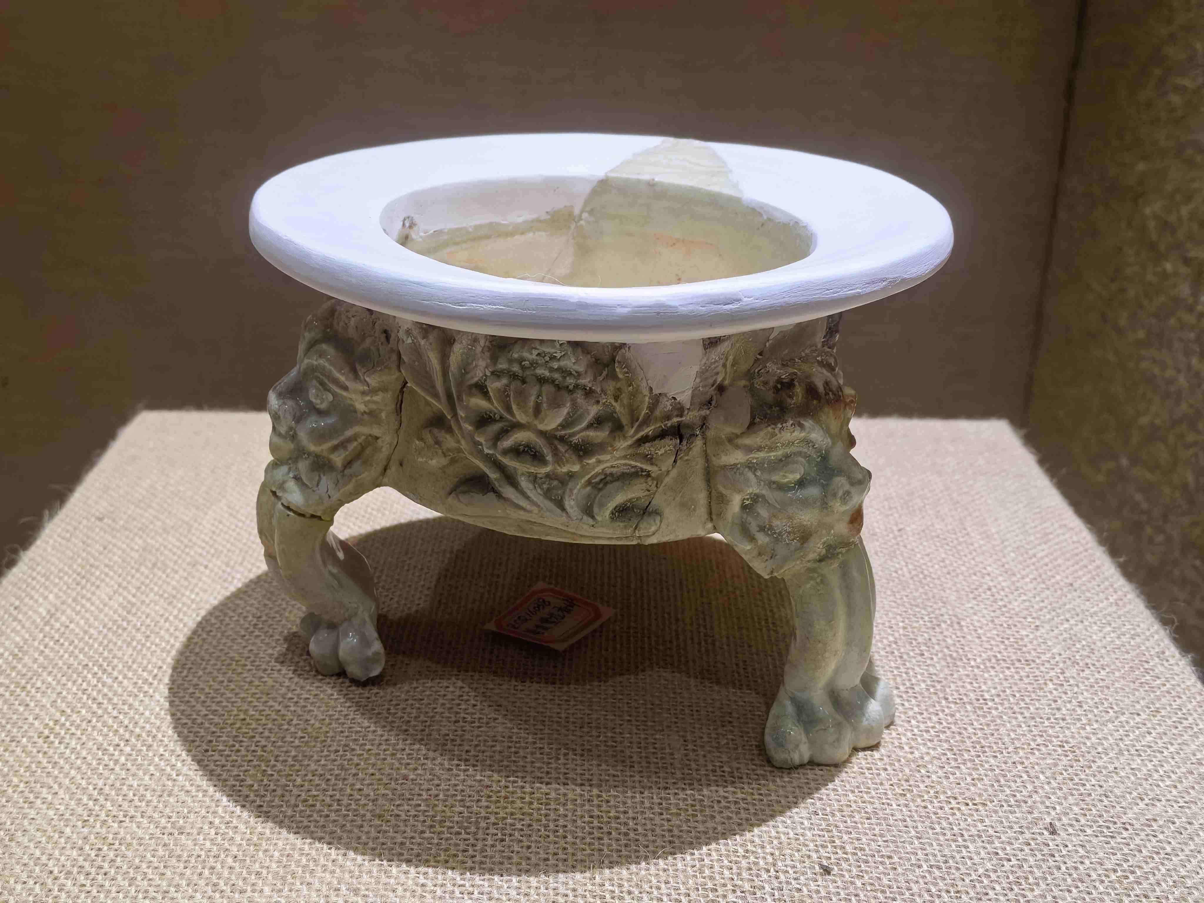 根据口沿部一小部分残片复原修复而成,瓷质坚硬致密,釉质厚实,可惜在烧制过程中变形而废弃,经过修复呈现出独特器形,华丽雍容。