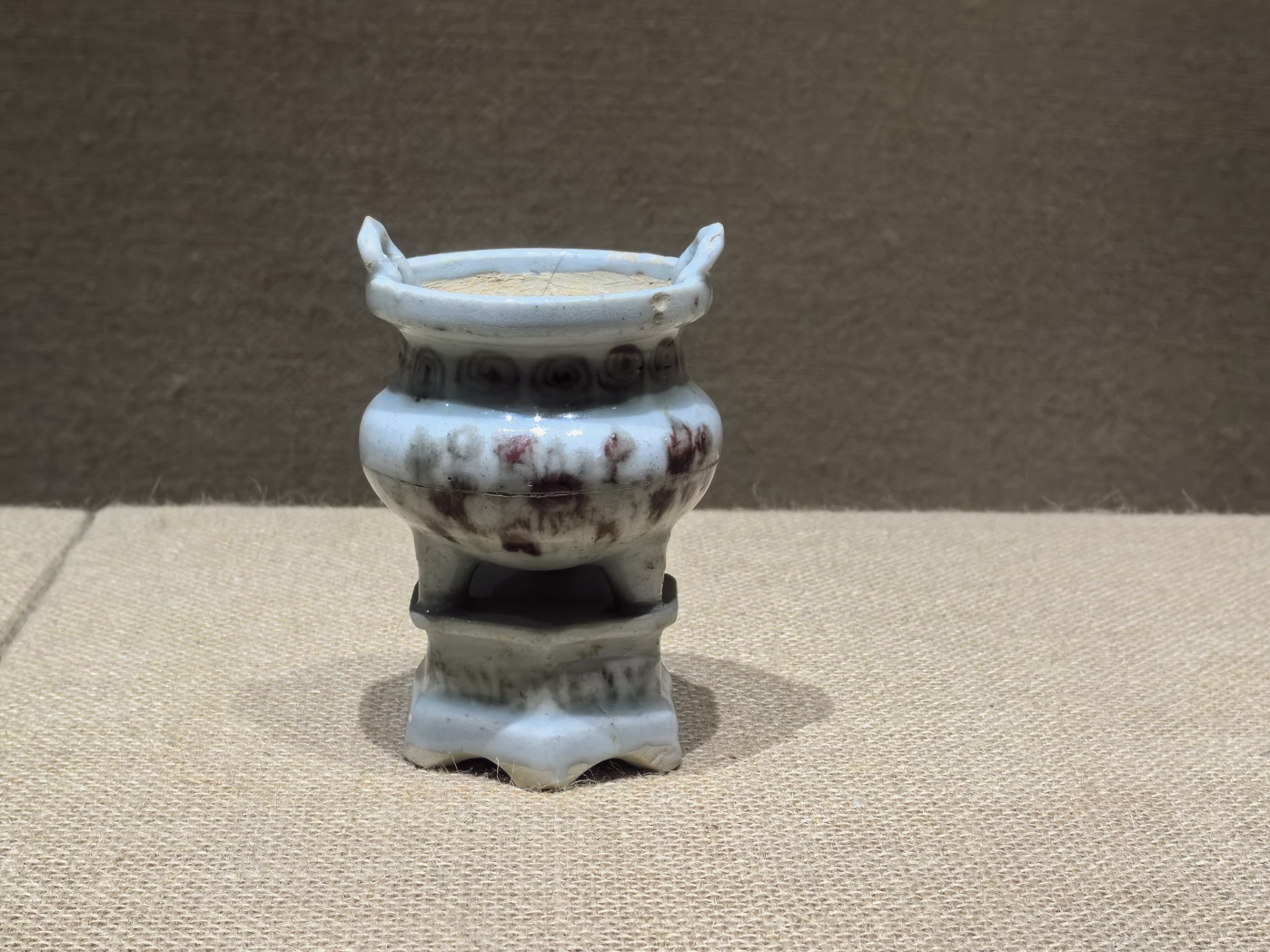 青花釉里红香炉,釉里红瓷器烧造非常难,元代釉里红就更难得一见。俗话说:要想穷烧釉里红,可见釉里红瓷器的成品有多么的珍贵。青花釉里红就更加不易烧成,青花钴蓝与铜红的最佳还原气氛达到一致是多么的困难,此件就没有达到预期的效果。