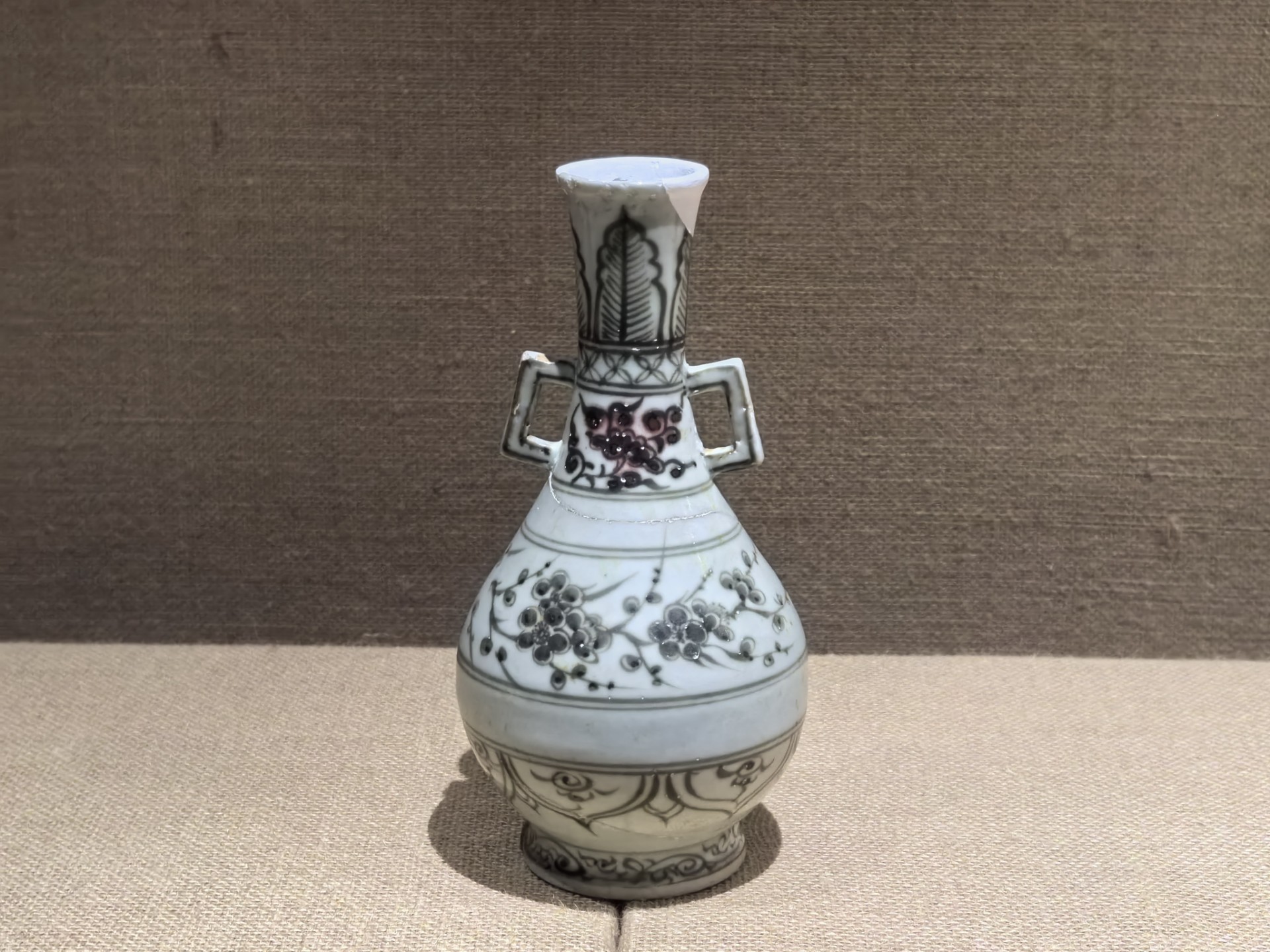 釉里红双耳梅花蕉叶纹玉壶春瓶,元代釉里红瓷器非常稀有,此件由于温度偏低,铜红釉的还原气氛没有达到最佳效果,因此,红色偏灰。即便如此,这样造型的釉里红瓷器仍然是十分稀少。
