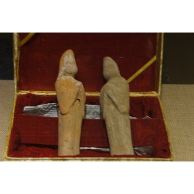 彩绘胡人陶俑一对,根据服饰及造型应是唐代彩绘胡人俑。商周时期用活人殉葬,春秋战国逐渐用模拟活人的俑来代替,表现家族财富和权势。)秦汉陶俑制作精细、风格写实。此对胡人俑系红陶制作。
